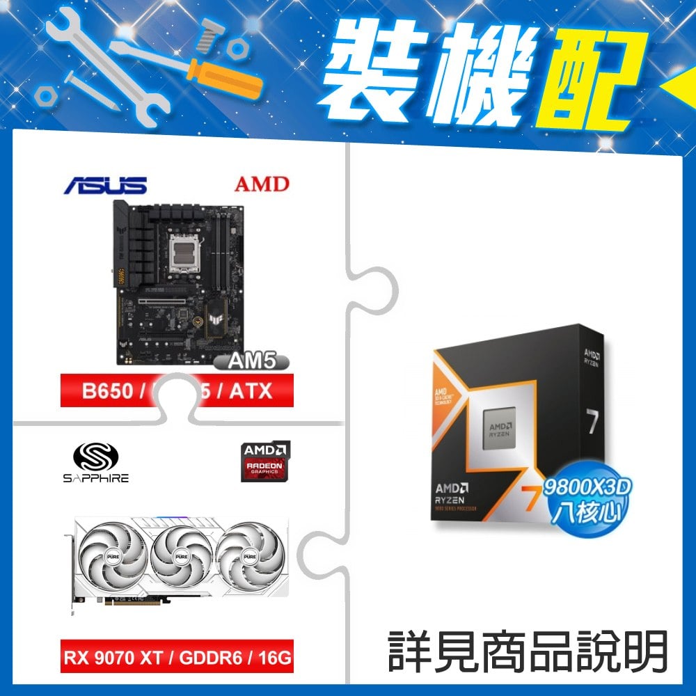 ☆裝機配★ AMD R7 9800X3D+華碩 TUF GAMING B650-E WIFI ATX主機板+藍寶石 PURE 極地 RX 9070 XT GAMING OC 16GB 顯示卡