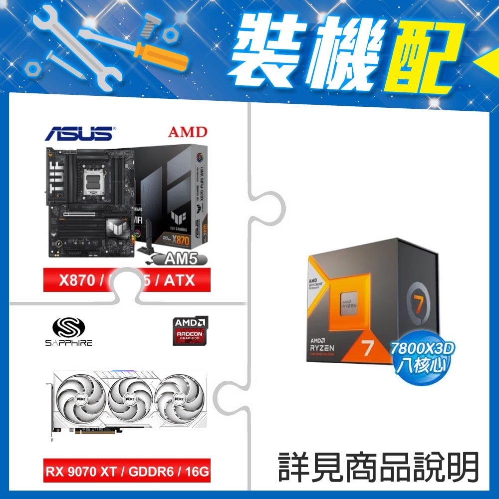☆裝機配★ AMD R7 7800X3D+華碩 TUF GAMING X870-PLUS WIFI ATX主機板+藍寶石 PURE 極地 RX 9070 XT GAMING OC 16GB 顯示卡