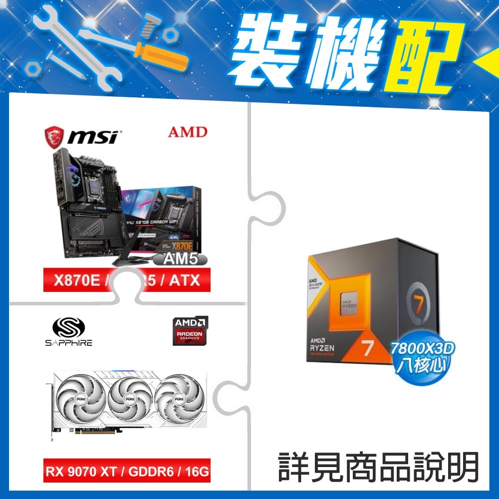 ☆裝機配★ AMD R7 7800X3D+微星 MPG X870E CARBON WIFI ATX主機板+藍寶石 PURE 極地 RX 9070 XT GAMING OC 16GB 顯示卡