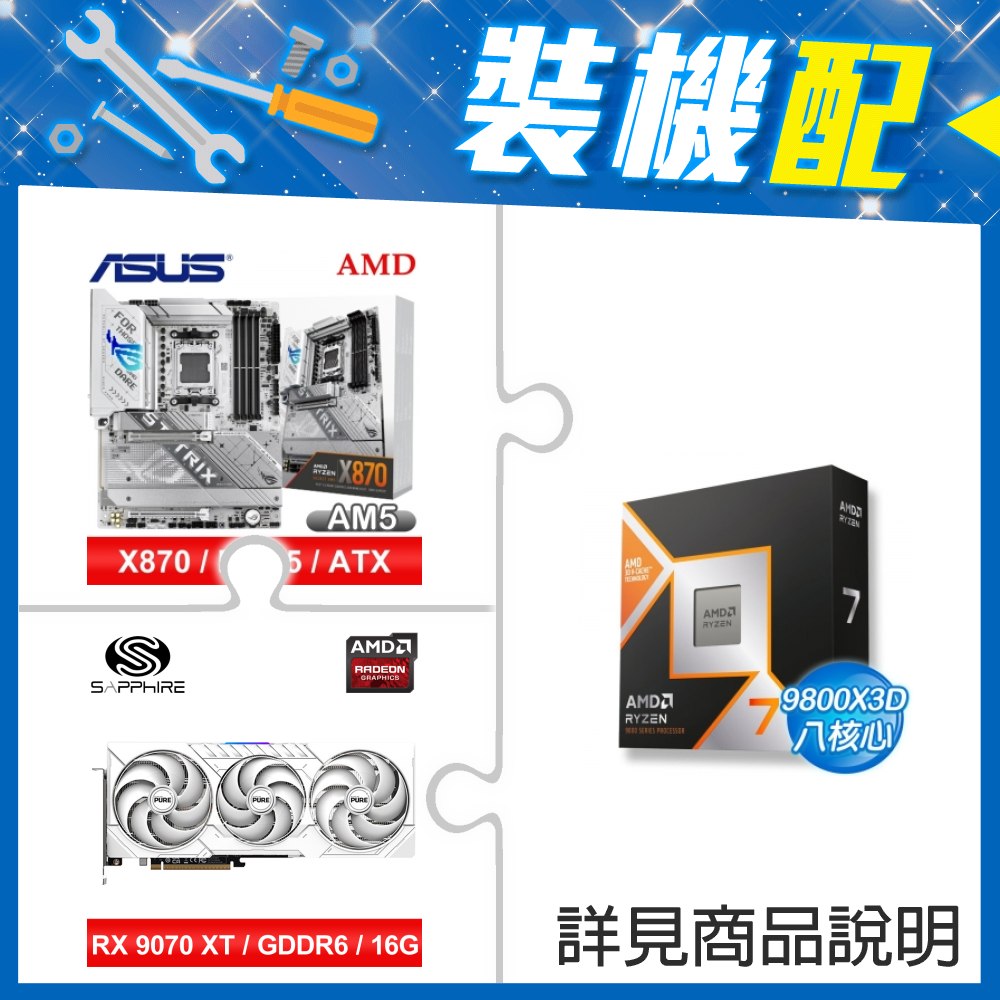 ☆裝機配★ AMD R7 9800X3D+華碩 ROG STRIX X870-A GAMING WIFI ATX主機板+藍寶石 PURE 極地 RX 9070 XT GAMING OC 16GB 顯示卡