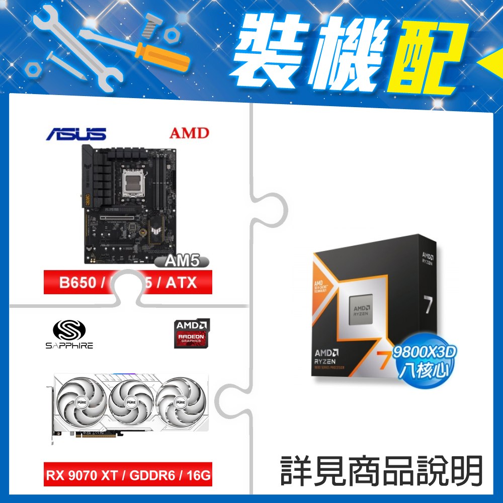 ☆裝機配★ AMD R7 9800X3D+華碩 TUF GAMING B650-PLUS WIFI ATX主機板+藍寶石 PURE 極地 RX 9070 XT GAMING OC 16GB 顯示卡