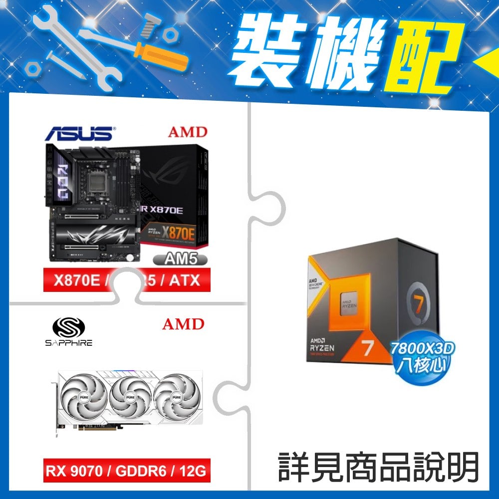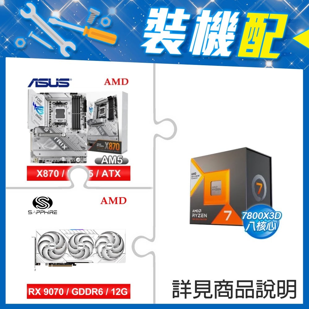 ☆裝機配★ AMD R7 7800X3D+華碩 ROG STRIX X870-A GAMING WIFI ATX主機板+藍寶石 PURE 極地 RX 9070 GRE GAMING OC 12GB 顯示卡