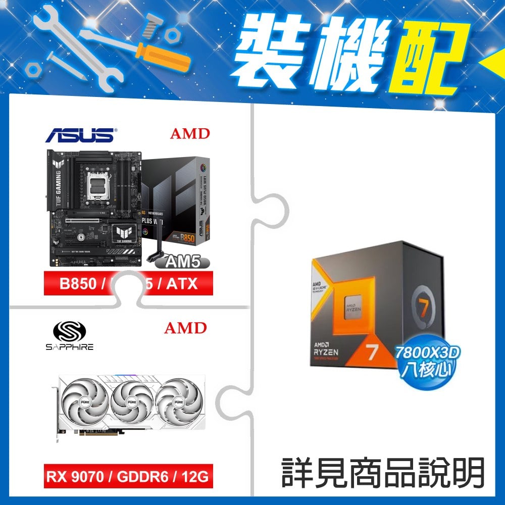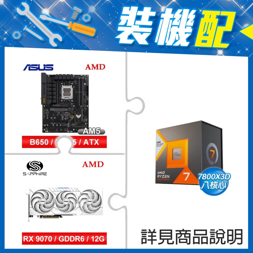 ☆裝機配★ AMD R7 7800X3D+華碩 TUF GAMING B850M-PLUS WIFI MATX主機板+藍寶石 PULSE 脈動 RX 9070 GRE GAMING 12GB 顯示卡