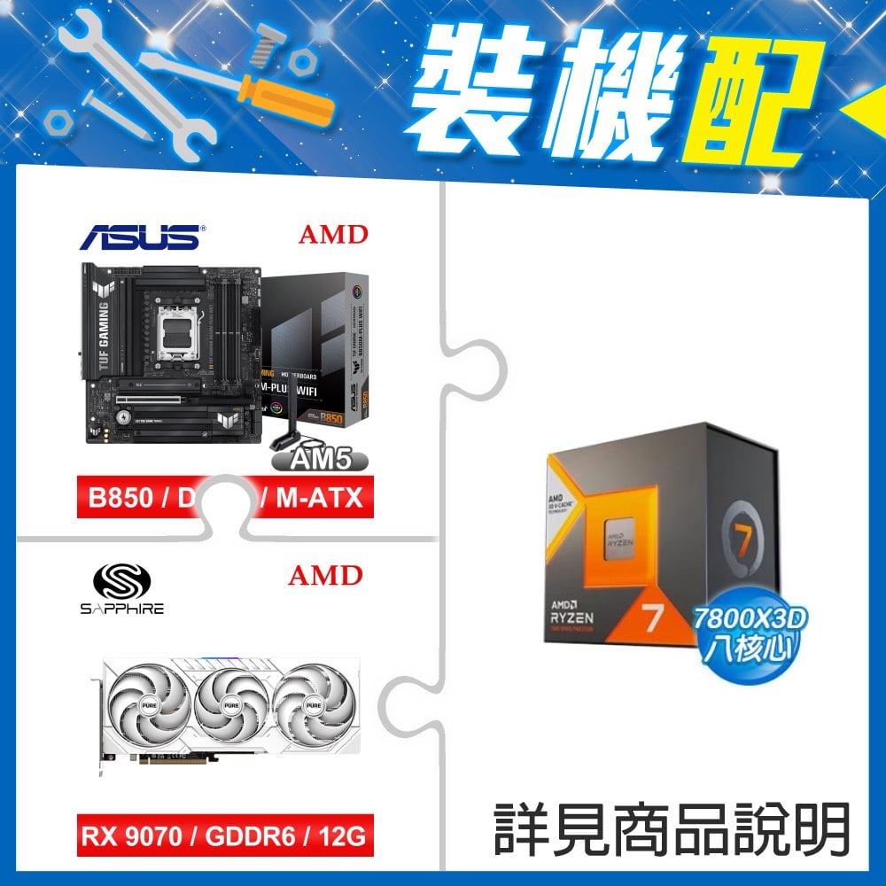 ☆裝機配★ AMD R7 7800X3D+華碩 TUF GAMING B850-PLUS WIFI ATX主機板+藍寶石 PULSE 脈動 RX 9070 GRE GAMING 12GB 顯示卡
