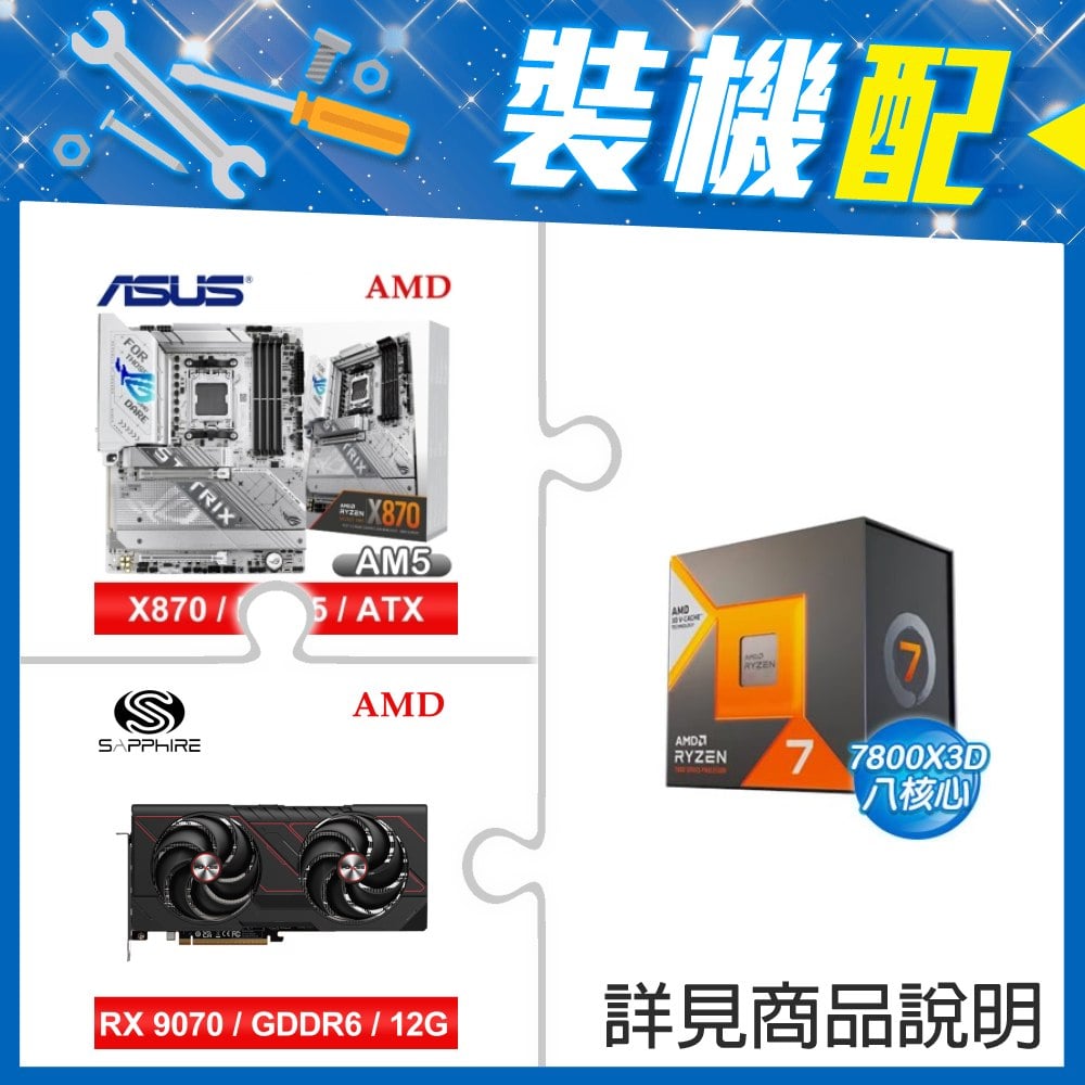 ☆裝機配★ AMD R7 7800X3D+華碩 ROG STRIX X870-A GAMING WIFI ATX主機板+藍寶石 PULSE 脈動 RX 9070 GRE GAMING 12GB 顯示卡