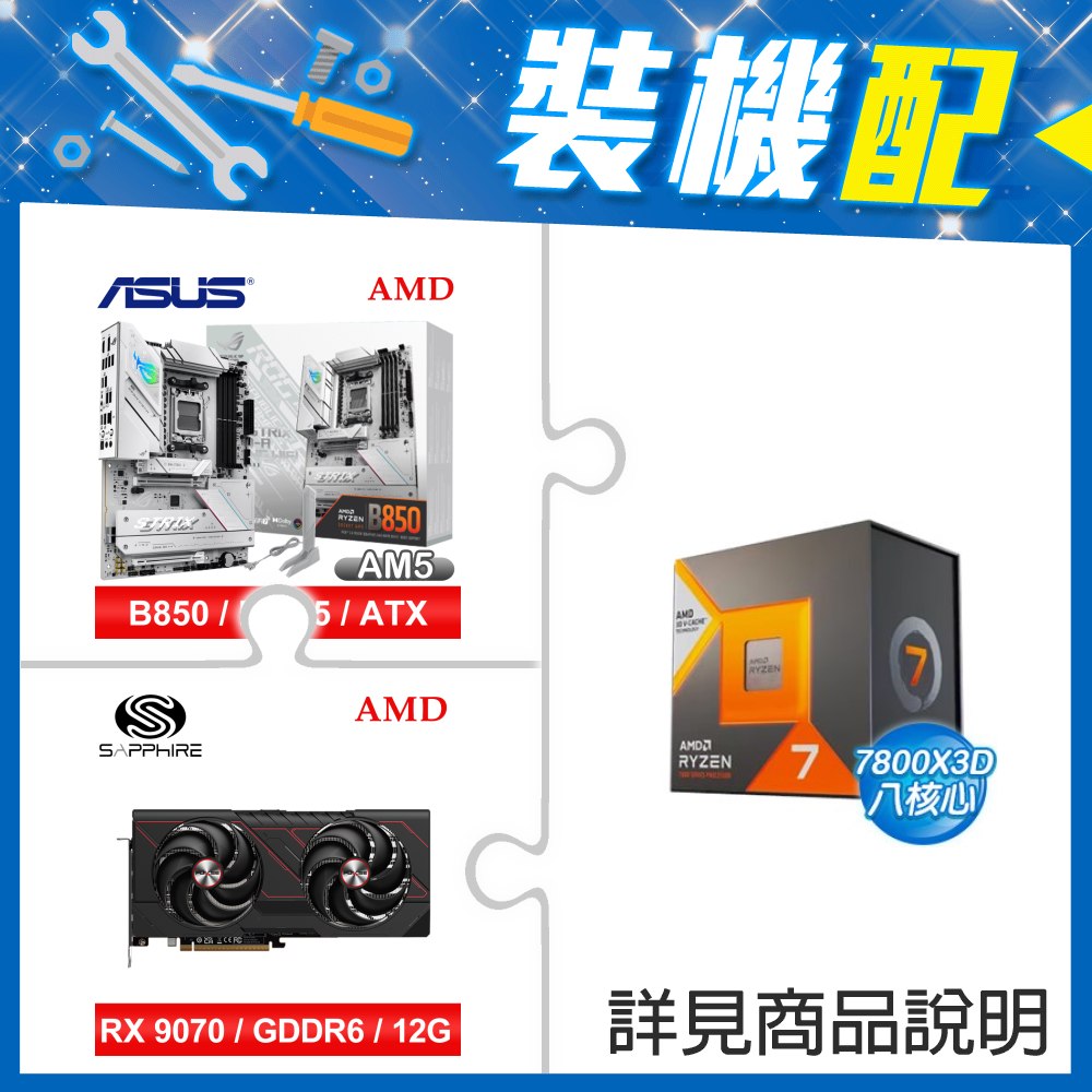 ☆裝機配★ AMD R7 7800X3D+華碩 TUF GAMING X870-PLUS WIFI ATX主機板+藍寶石 PURE 極地 RX 9070 GRE GAMING OC 12GB 顯示卡