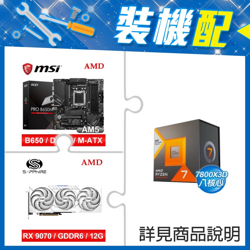 ☆裝機配★ AMD R7 7800X3D+微星 PRO B650M-A WIFI D5 M-ATX主機板+藍寶石 PURE 極地 RX 9070 GRE GAMING OC 12GB 顯示卡