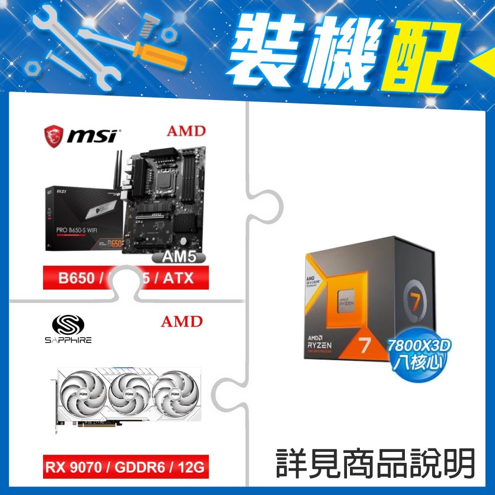 ☆裝機配★ AMD R7 7800X3D+微星 PRO B650-S WIFI ATX主機板+藍寶石 PULSE 脈動 RX 9070 GRE GAMING 12GB 顯示卡
