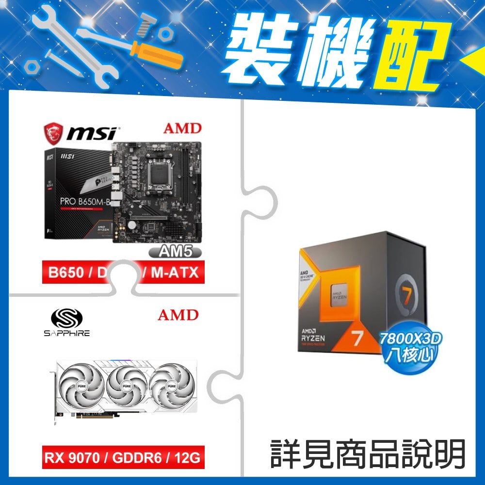 ☆裝機配★ AMD R7 7800X3D+微星 PRO B650M-A WIFI D5 M-ATX主機板+藍寶石 PURE 極地 RX 9070 GRE GAMING OC 12GB 顯示卡