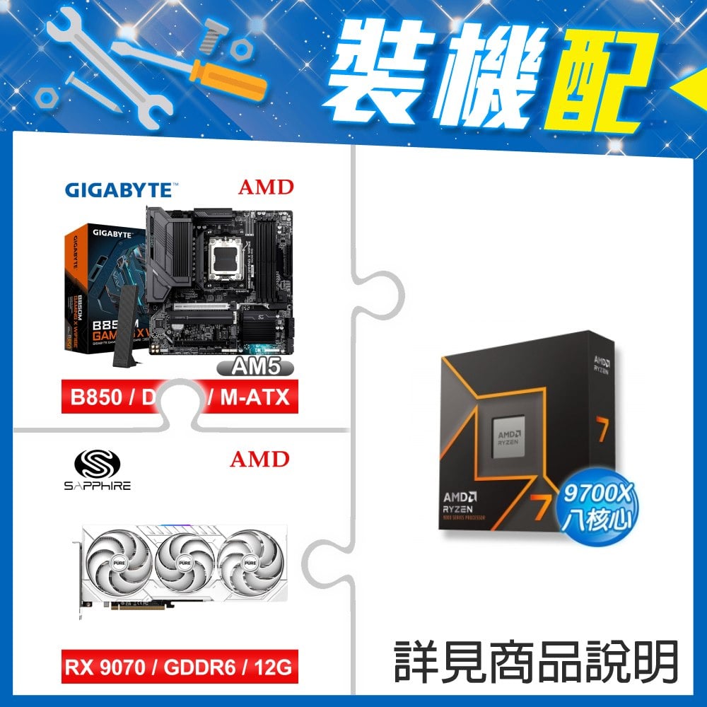 ☆裝機配★ AMD R7 9700X+技嘉 B850M GAMING X WIFI6E MATX主機板+藍寶石 PURE 極地 RX 9070 GRE GAMING OC 12GB 顯示卡