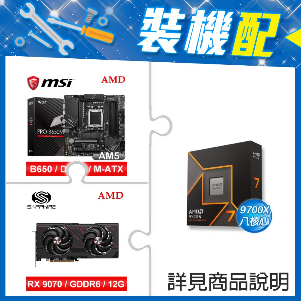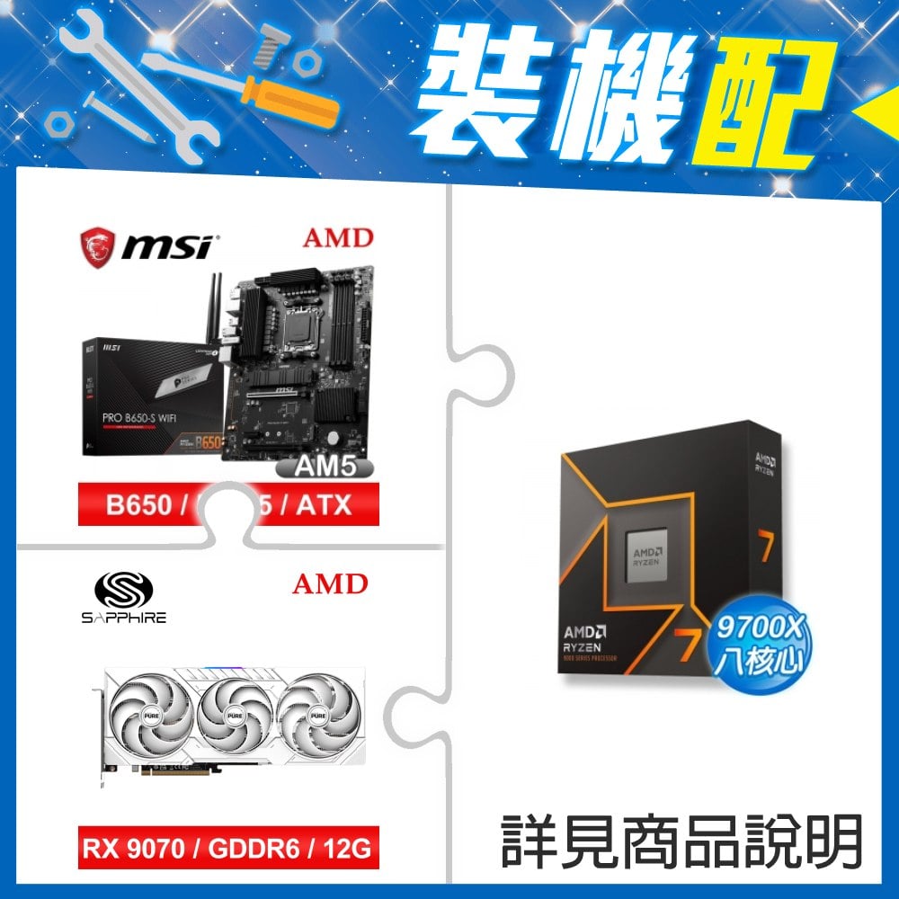 ☆裝機配★ AMD R7 9700X+微星 PRO B650-S WIFI ATX主機板+藍寶石 PULSE 脈動 RX 9070 GRE GAMING 12GB 顯示卡