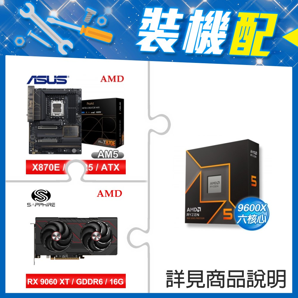 ☆裝機配★ AMD R5 9600X+華碩 PROART X870E-CREATOR WIFI ATX主機板+藍寶石 PULSE 脈動 RX 9060 XT GAMING OC 16GB 顯示卡
