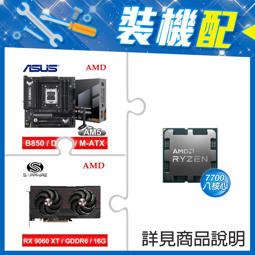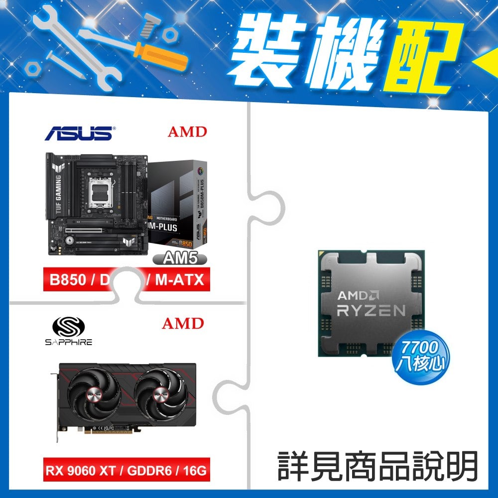 ☆裝機配★ AMD R7 7700 MPK+華碩 TUF GAMING B850M-PLUS WIFI MATX主機板+藍寶石 PULSE 脈動 RX 9060 XT GAMING OC 16GB 顯示卡