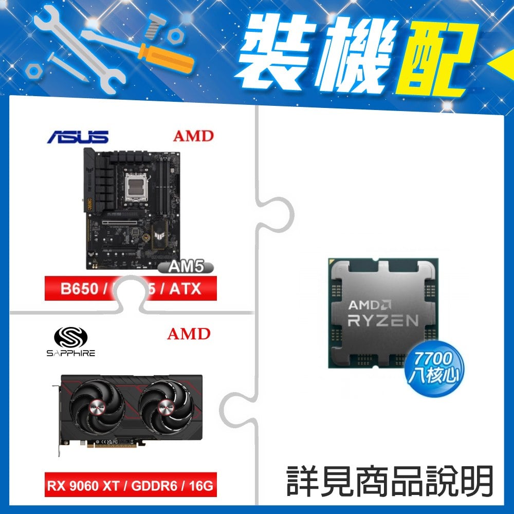 ☆裝機配★ AMD R7 7700 MPK+華碩 TUF GAMING B650-PLUS WIFI ATX主機板+藍寶石 PULSE 脈動 RX 9060 XT GAMING OC 16GB 顯示卡