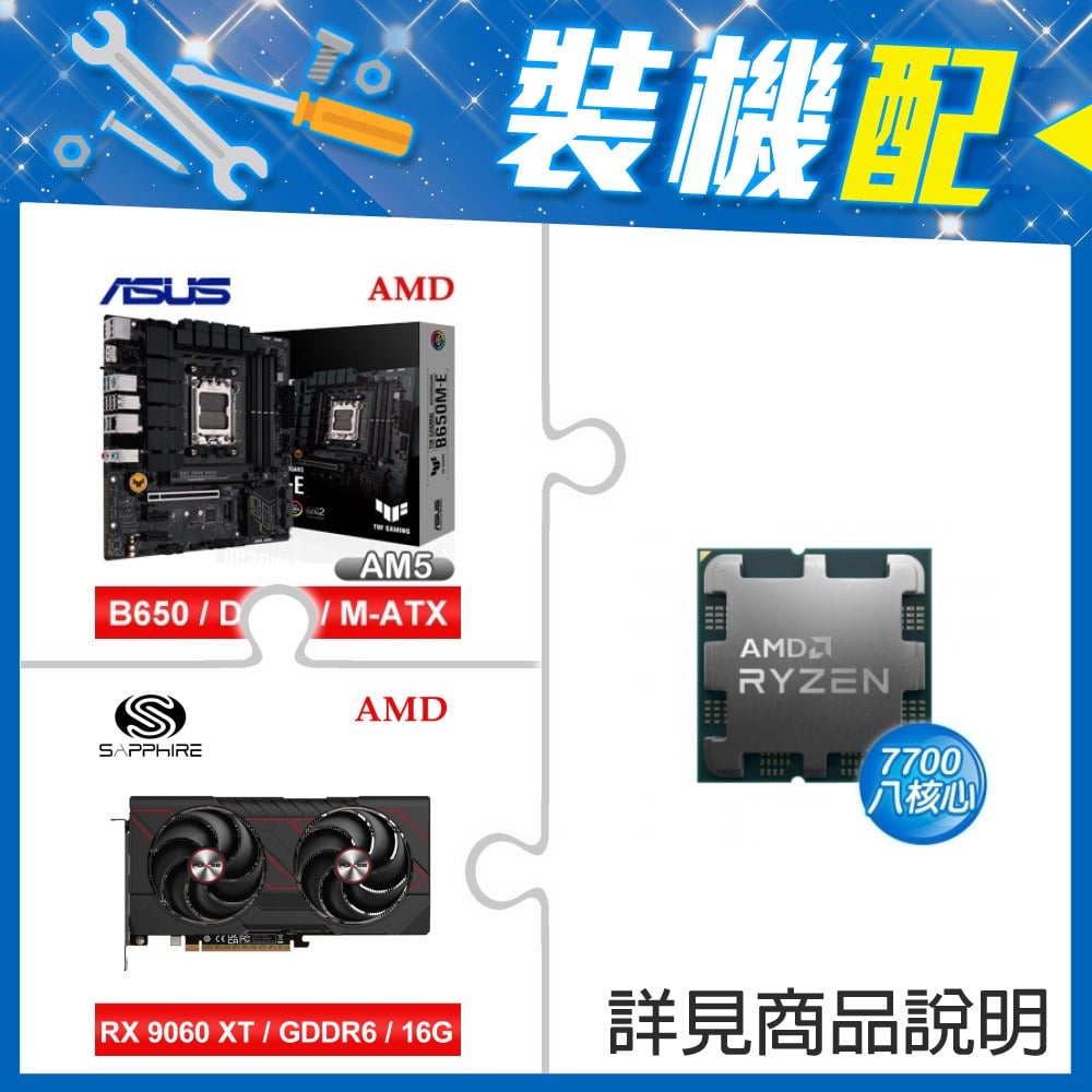 ☆裝機配★ AMD R7 7700 MPK+華碩 TUF GAMING B650M-E M-ATX主機板+藍寶石 PULSE 脈動 RX 9060 XT GAMING OC 16GB 顯示卡