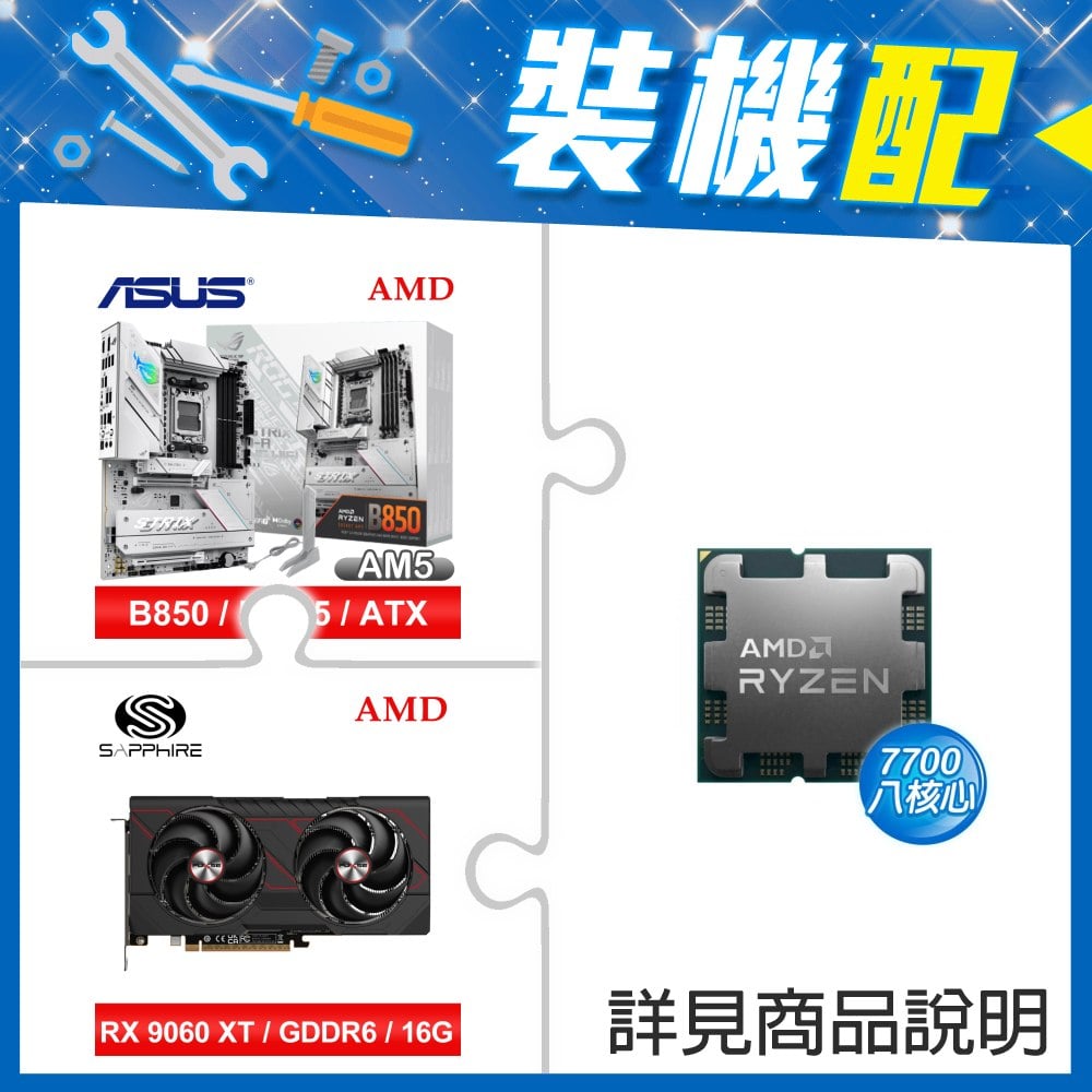 ☆裝機配★ AMD R7 7700 MPK+華碩 ROG STRIX B850-A GAMING WIFI ATX主機板+藍寶石 PULSE 脈動 RX 9060 XT GAMING OC 16GB 顯示卡