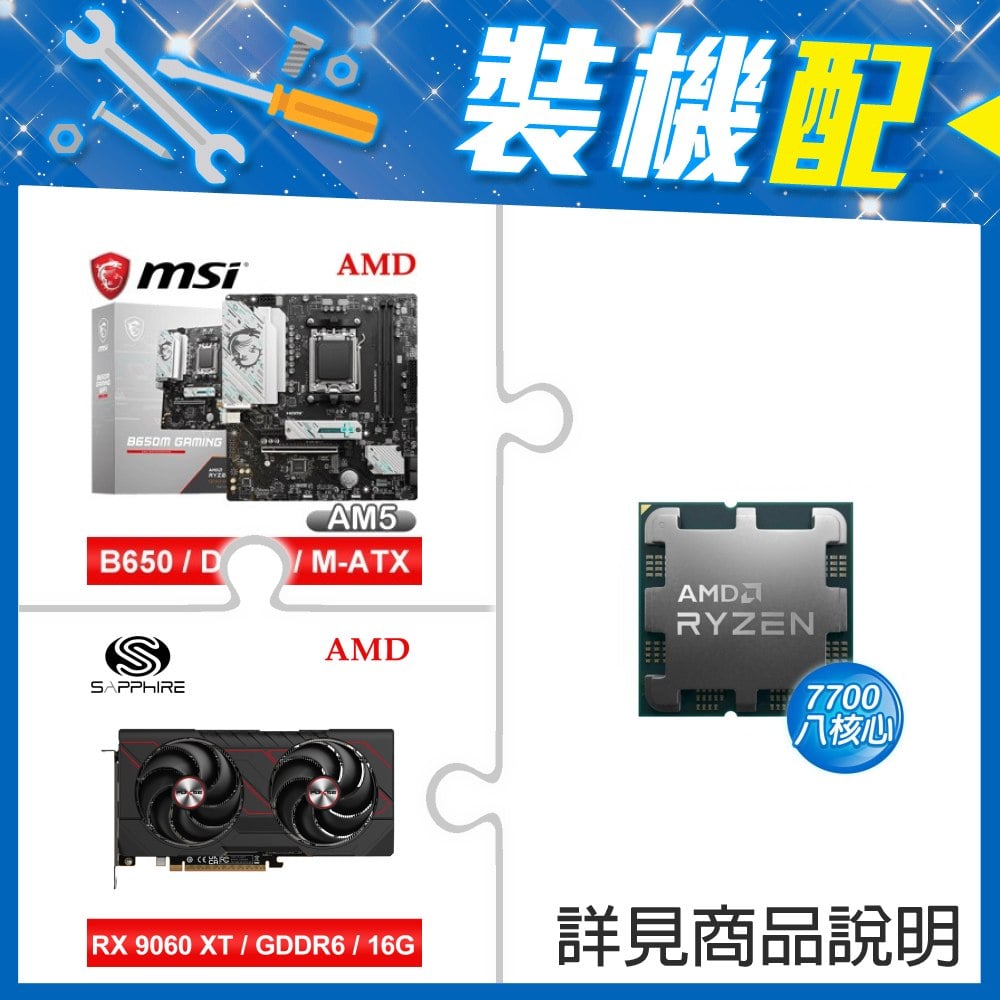 ☆裝機配★ AMD R7 7700 MPK+微星 B650M GAMING WIFI M-ATX主機板+藍寶石 PULSE 脈動 RX 9060 XT GAMING OC 16GB 顯示卡