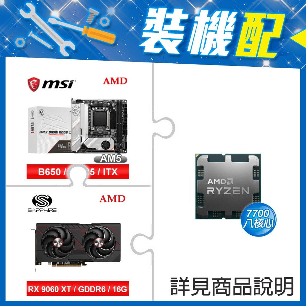 ☆裝機配★ AMD R7 7700 MPK+微星 MPG B650I EDGE WIFI ITX主機板+藍寶石 PULSE 脈動 RX 9060 XT GAMING OC 16GB 顯示卡