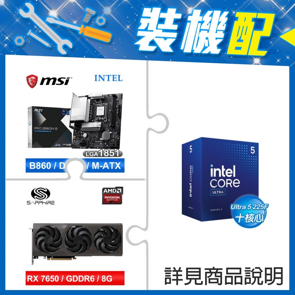 ☆裝機配★ Core U5 225F+微星 PRO B860M-B MATX主機板+藍寶石 黑鑽版 RX 7650 GRE GAMING OC 8GB 顯示卡