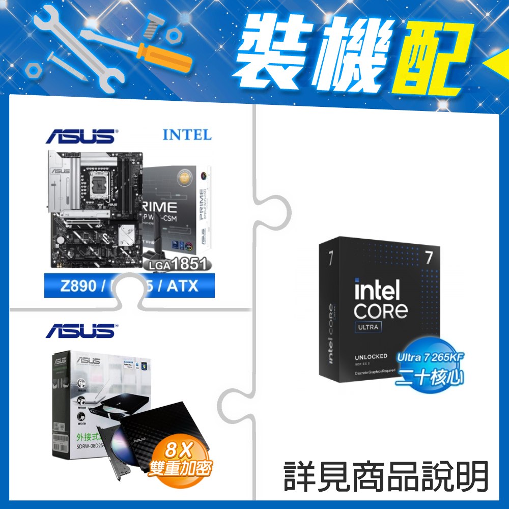 ☆裝機配★ Core U7 265KF+華碩 PRIME Z890-P WIFI-CSM D5 ATX主機板+華碩 SDRW-08D2S-U 外接式燒錄機《黑》