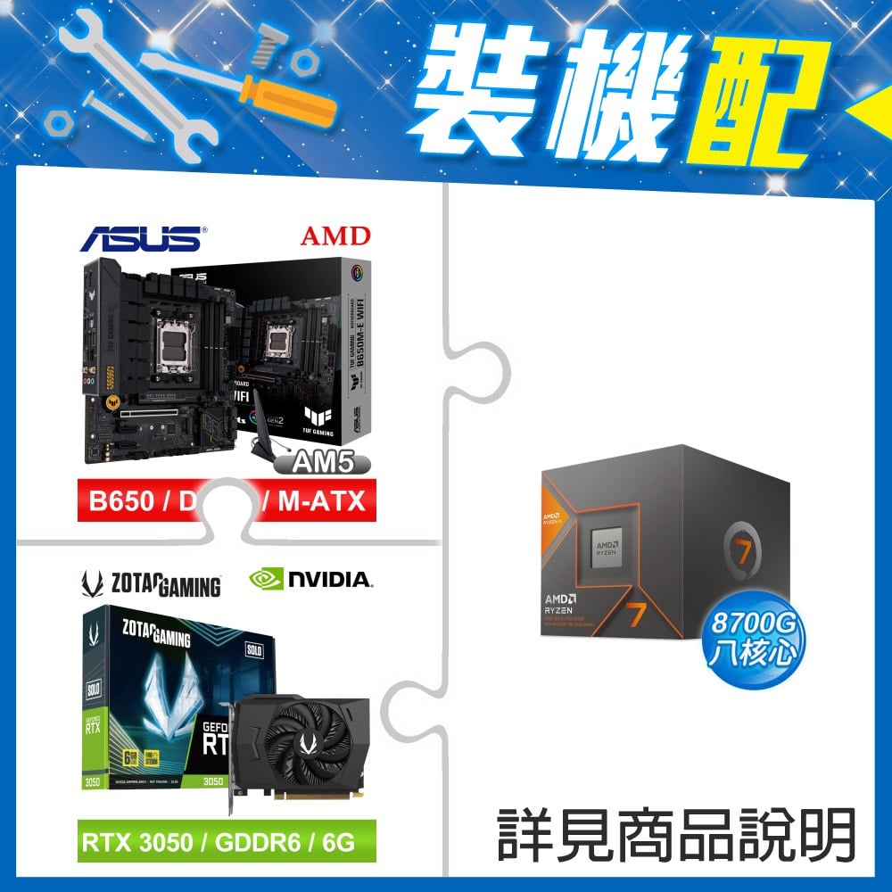 ☆裝機配★ AMD R7 8700G+華碩 TUF GAMING B650M-E WIFI D5 MATX主機板+ZOTAC RTX3050 6G GDDR6 Solo 顯示卡