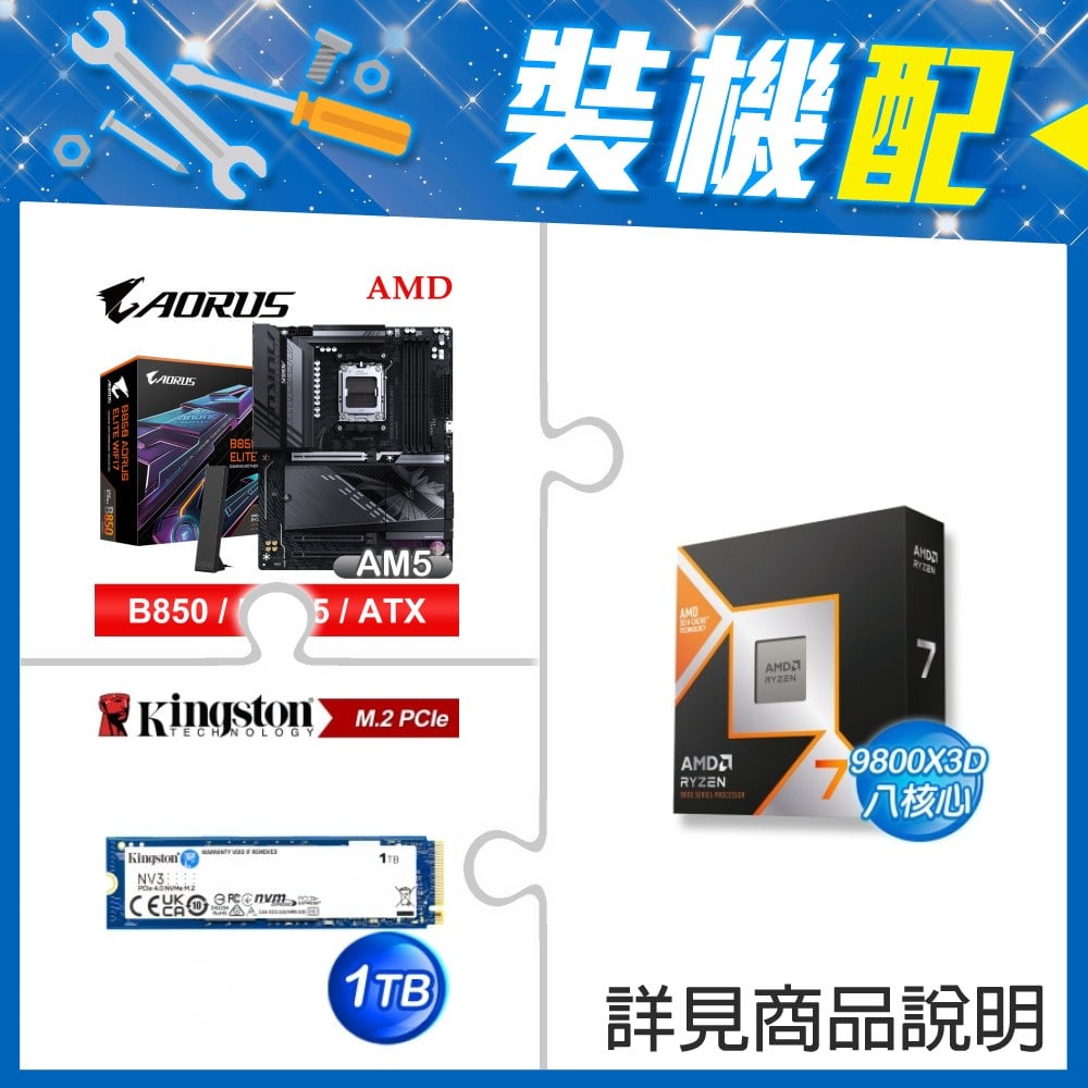 ☆裝機配★ AMD R7 9800X3D+技嘉 B850 AORUS ELITE WIFI7 ATX主機板+金士頓 NV3 1TB M.2 PCIe SSD