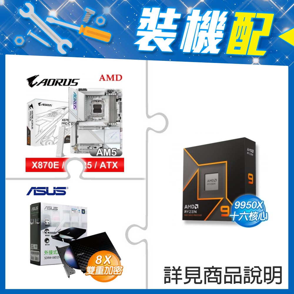 ☆裝機配★ AMD R9 9950X+技嘉 X870E AORUS PRO ICE ATX主機板+華碩 SDRW-08D2S-U 外接式燒錄機《黑》