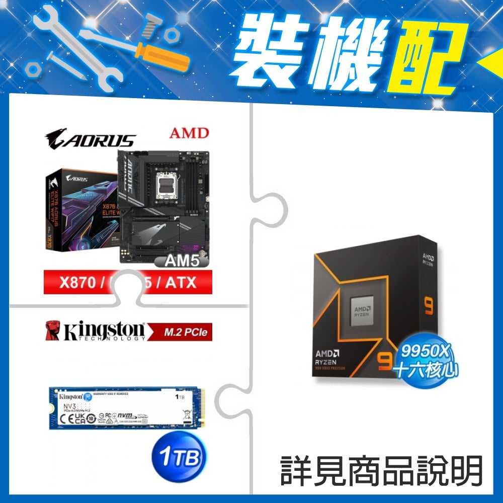 ☆裝機配★ AMD R9 9950X+技嘉 X870 AORUS ELITE WIFI7 ATX主機板+金士頓 NV3 1TB M.2 PCIe SSD