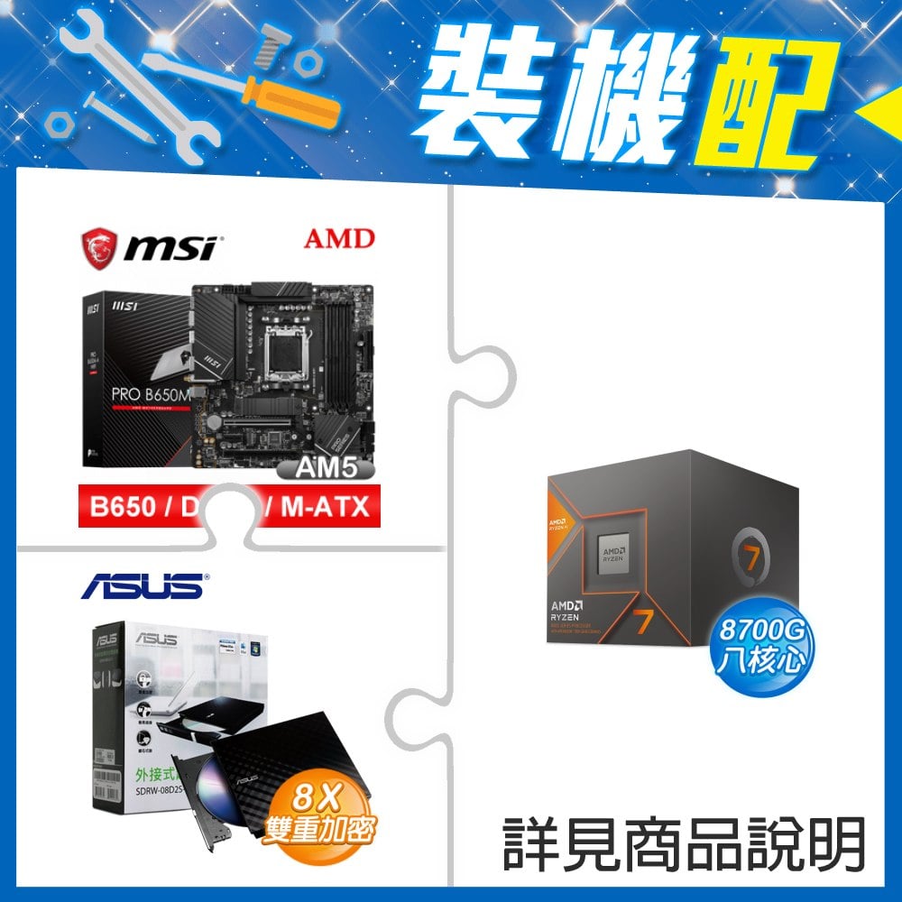 ☆裝機配★ AMD R7 8700G+微星 PRO B650M-A WIFI D5 M-ATX主機板+華碩 SDRW-08D2S-U 外接式燒錄機《黑》