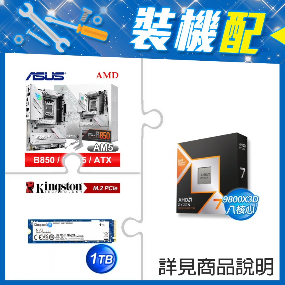 ☆裝機配★ AMD R7 9800X3D+華碩 ROG STRIX B850-A GAMING WIFI ATX主機板+金士頓 NV3 1TB M.2 PCIe SSD