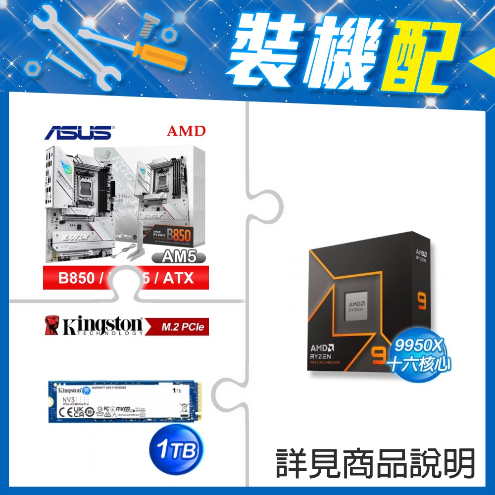 ☆裝機配★ AMD R9 9950X+華碩 ROG STRIX B850-A GAMING WIFI ATX主機板+金士頓 NV3 1TB M.2 PCIe SSD