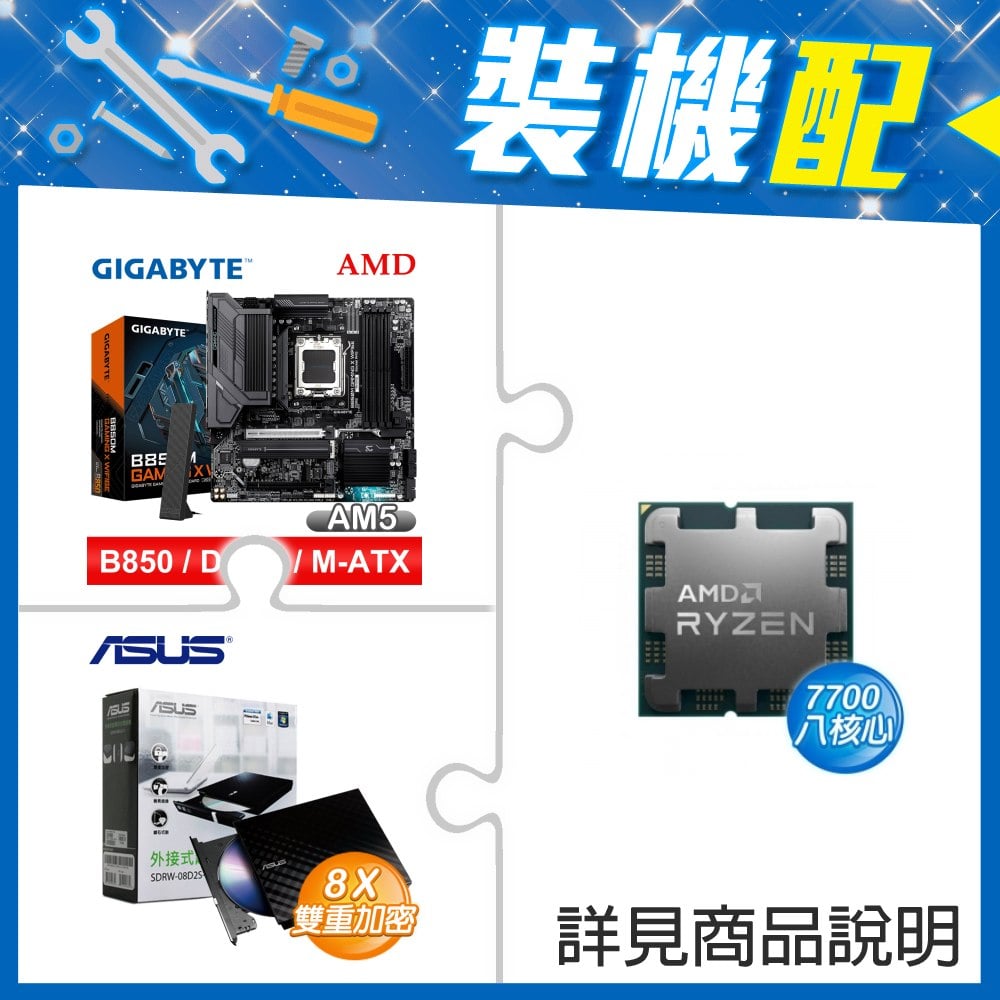 ☆裝機配★ AMD R7 7700 MPK+技嘉 B850M GAMING X WIFI6E MATX主機板+華碩 SDRW-08D2S-U 外接式燒錄機《黑》