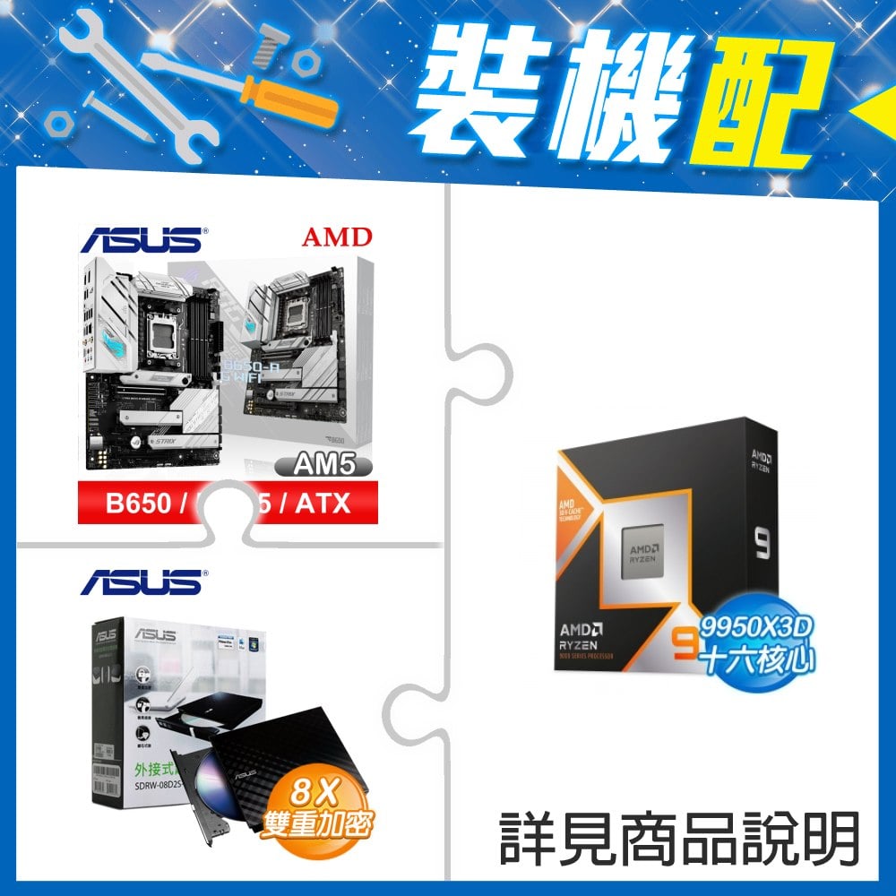☆裝機配★ AMD R9 9950X3D+華碩 ROG STRIX B650-A GAMING WIFI ATX主機板+華碩 SDRW-08D2S-U 外接式燒錄機《黑》