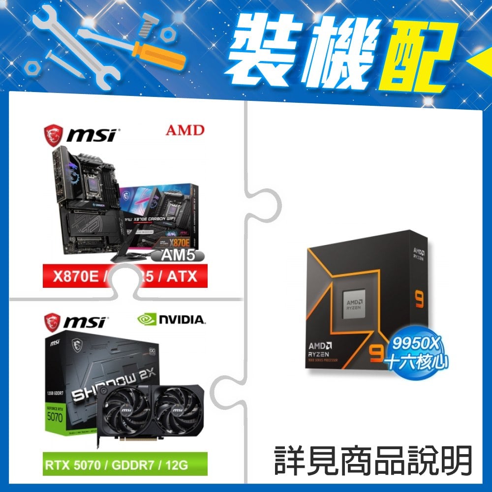 ☆裝機配★ AMD R9 9900X+微星 MPG X870E CARBON WIFI ATX主機板+微星 RTX 5070 12G SHADOW 2X OC 顯示卡