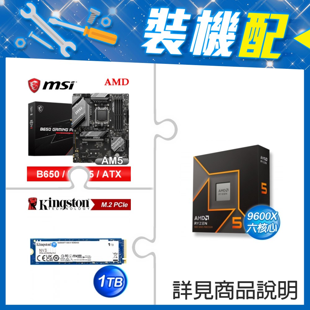 ☆裝機配★ AMD R5 9600X+微星 B650 GAMING PLUS WIFI D5 ATX主機板+金士頓 NV3 1TB M.2 PCIe SSD