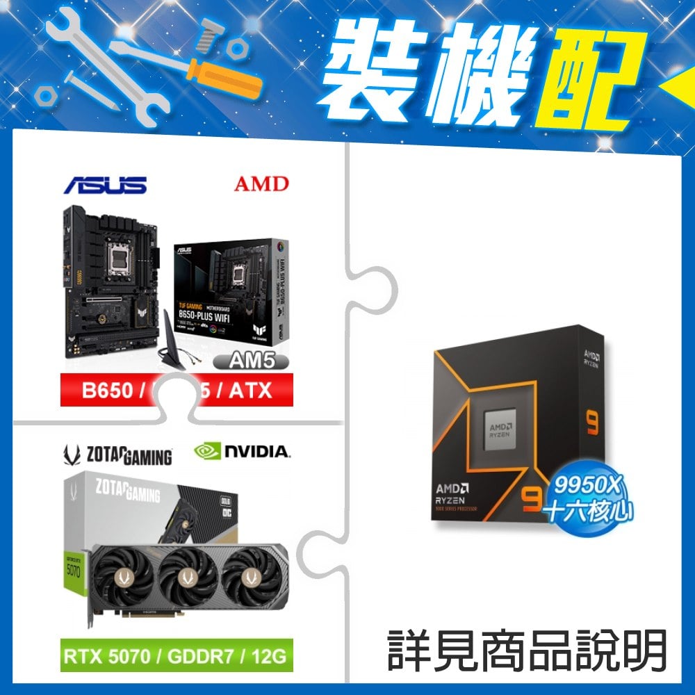 ☆裝機配★ AMD R9 9950X+華碩 TUF GAMING B650-PLUS WIFI ATX主機板+索泰 RTX 5070 SOLID OC 12G 顯示卡