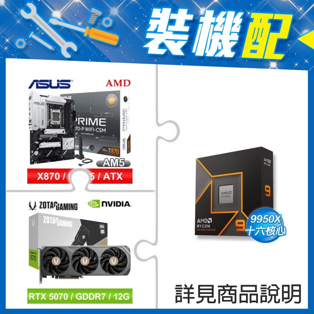 ☆裝機配★ AMD R9 9950X+華碩 PRIME X870-P WIFI-CSM ATX主機板+索泰 RTX 5070 SOLID OC 12G 顯示卡