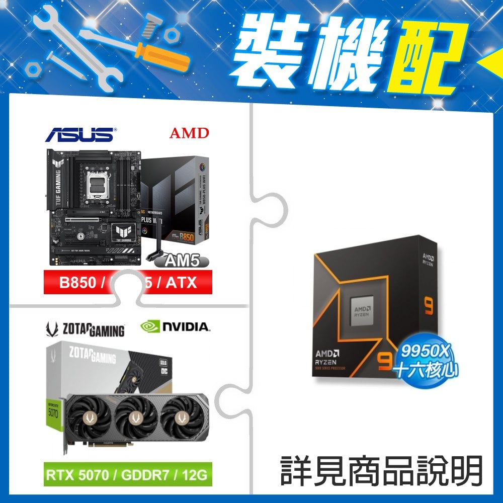 ☆裝機配★ AMD R9 9950X+華碩 TUF GAMING B850-PLUS WIFI ATX主機板+索泰 RTX 5070 SOLID OC 12G 顯示卡