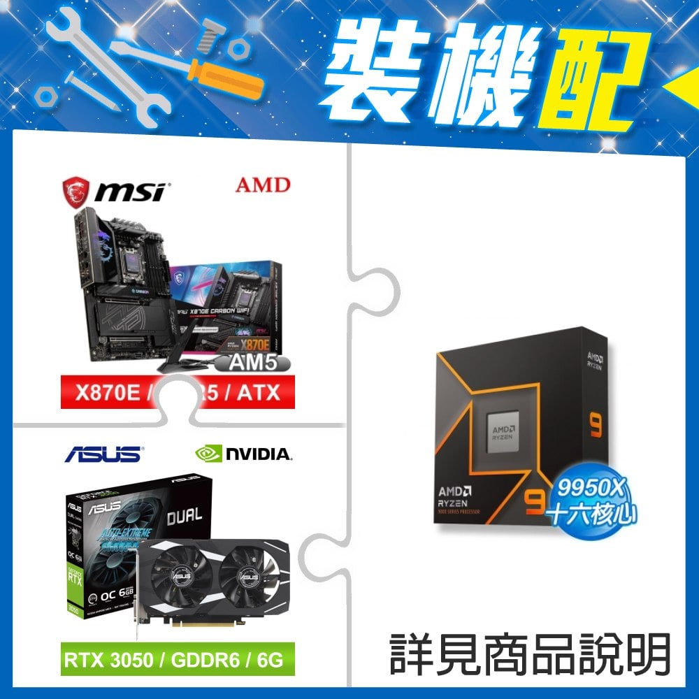 ☆裝機配★ AMD R9 9950X+微星 MPG X870E CARBON WIFI ATX主機板+華碩 DUAL-RTX3050-O6G 顯示卡