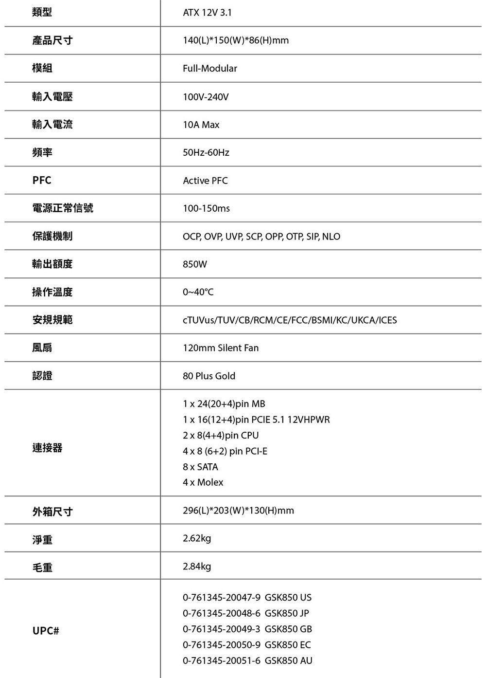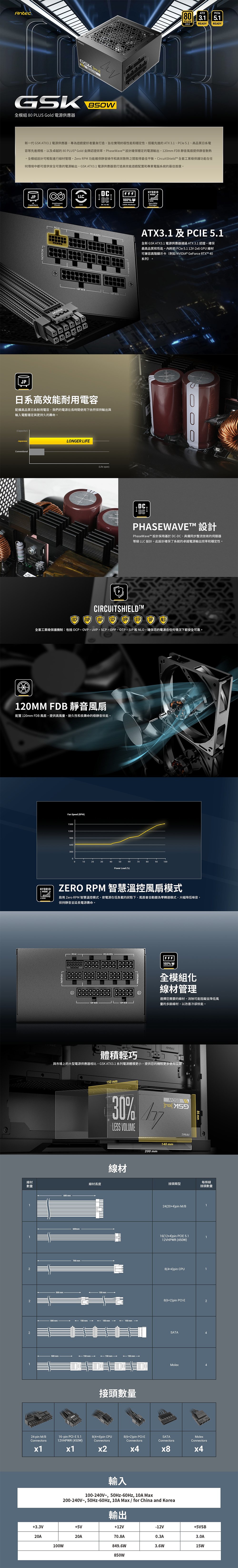 - 全新 GSK Gold 搭載先進的 ATX3.1、PCIe 5.1