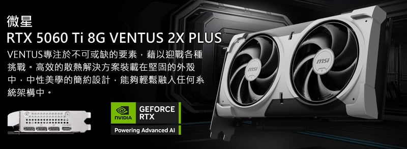 - 顯示卡:微星 RTX 5060 Ti 8G VENTUS 2X PLUS