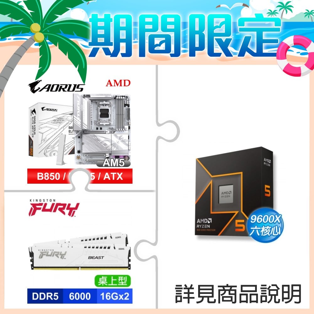 ☆期間限定★ AMD R5 9600X+技嘉 B850 AORUS ELITE WIFI7 ICE ATX主機板+金士頓 FURY Beast 獸獵者 DDR5-6000 16G*2 CL30 記憶體《白》