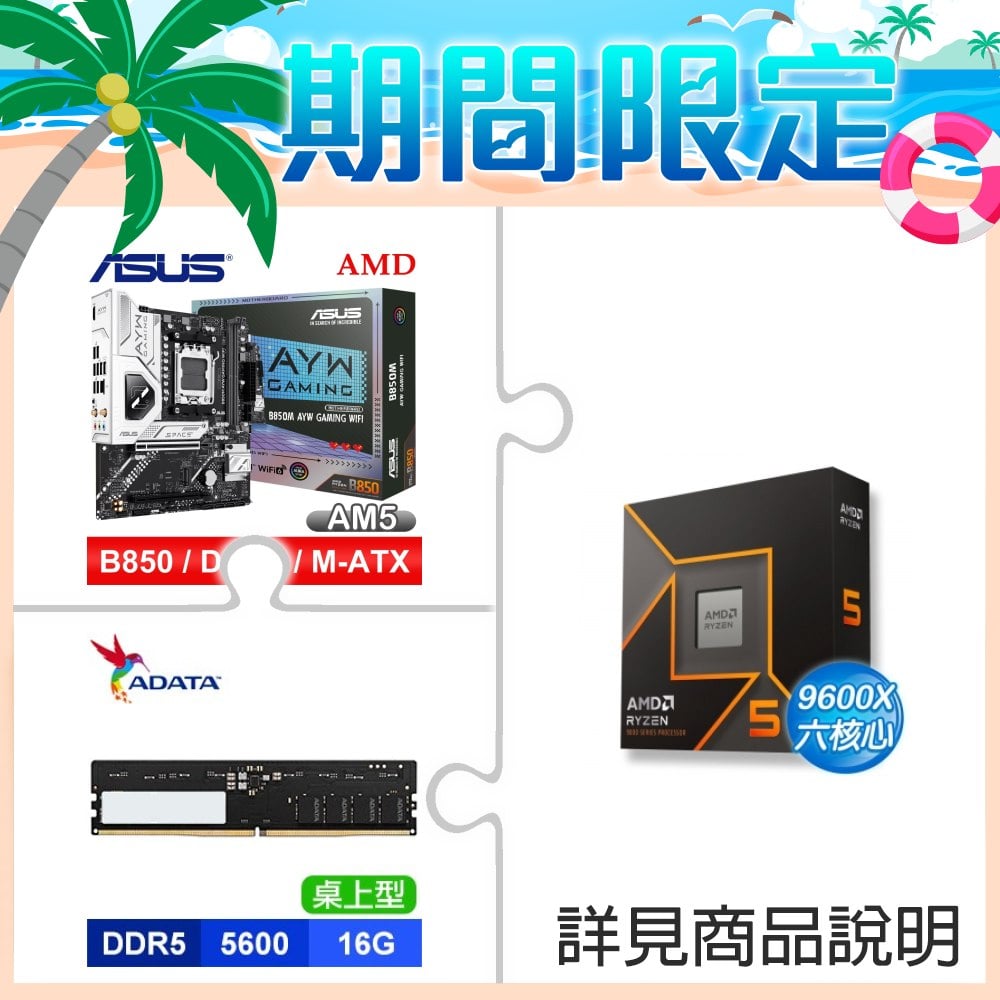 ☆期間限定★ AMD R5 9600X+華碩 B850M-AYW-GAMING-WIFI M-ATX主機板+威剛 DDR5-5600 16G 記憶體