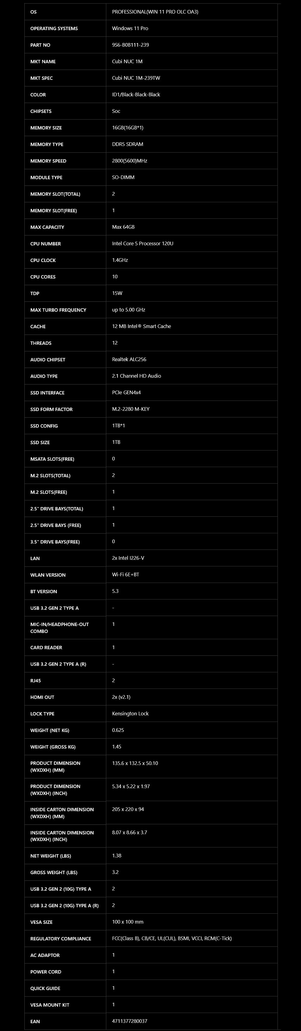 MSI 微星 Cubi NUC 1M-239TW-B5120U16GS1TX11PA 迷你電腦