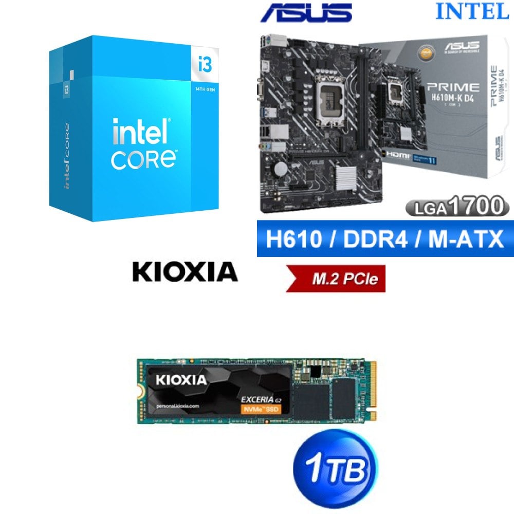☆裝機配★ i3-14100F+華碩 PRIME H610M-K D4-CSM M-ATX主機板+鎧俠 EXCERIA G2 1TB PCIe Gen3x4 SSD