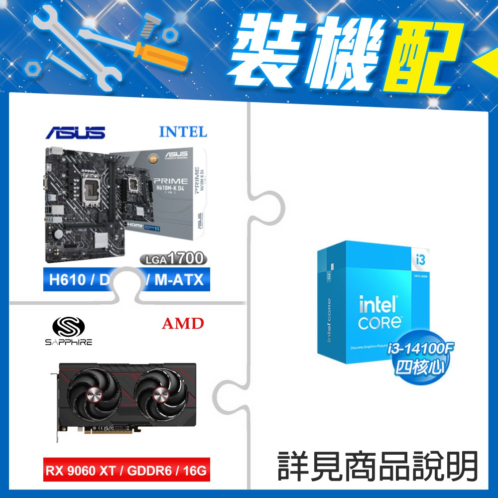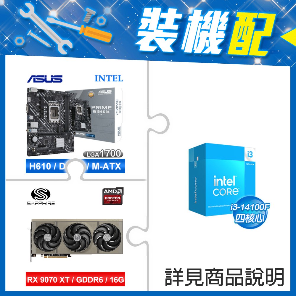 ☆裝機配★ i3-14100+華碩 PRIME H610M-K D4-CSM M-ATX主機板+藍寶石 PURE 極地 RX 9070 XT GAMING OC 16GB 顯示卡