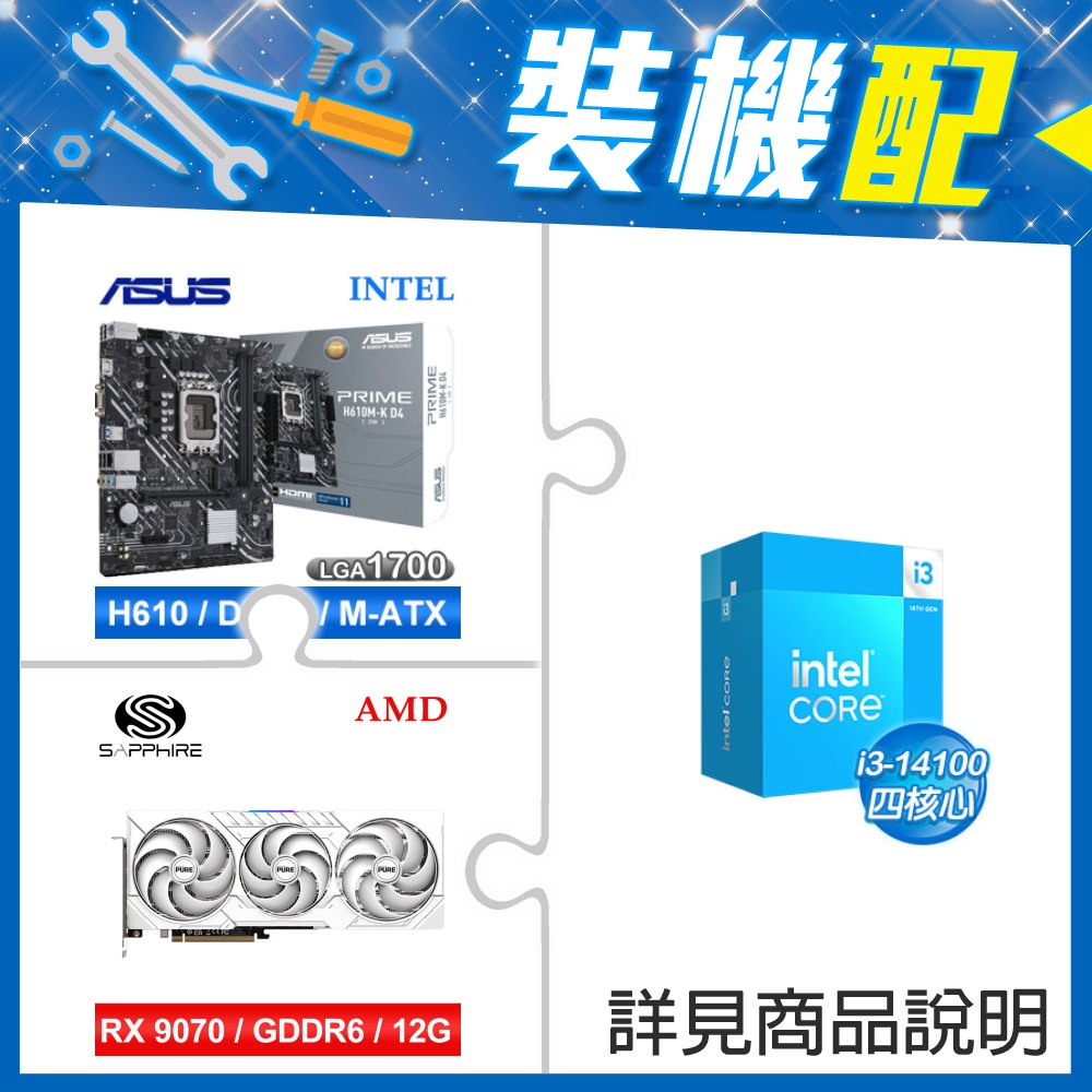 ☆裝機配★ i3-14100+華碩 PRIME H610M-K D4-CSM M-ATX主機板+藍寶石 PULSE 脈動 RX 9070 GRE GAMING 12GB 顯示卡