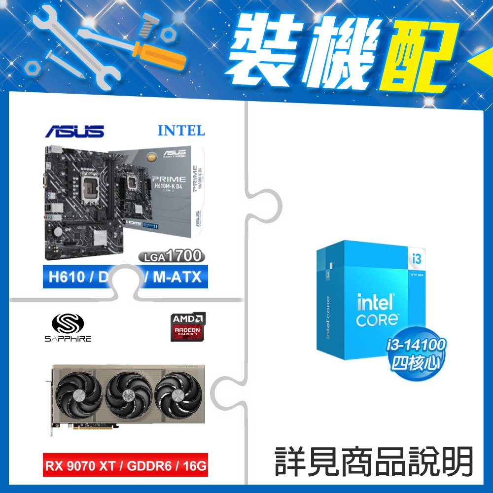 ☆裝機配★ i3-14100+華碩 PRIME H610M-K D4-CSM M-ATX主機板+藍寶石 NITRO+ 氮動 RX 9070 XT GAMING OC 16GB 顯示卡