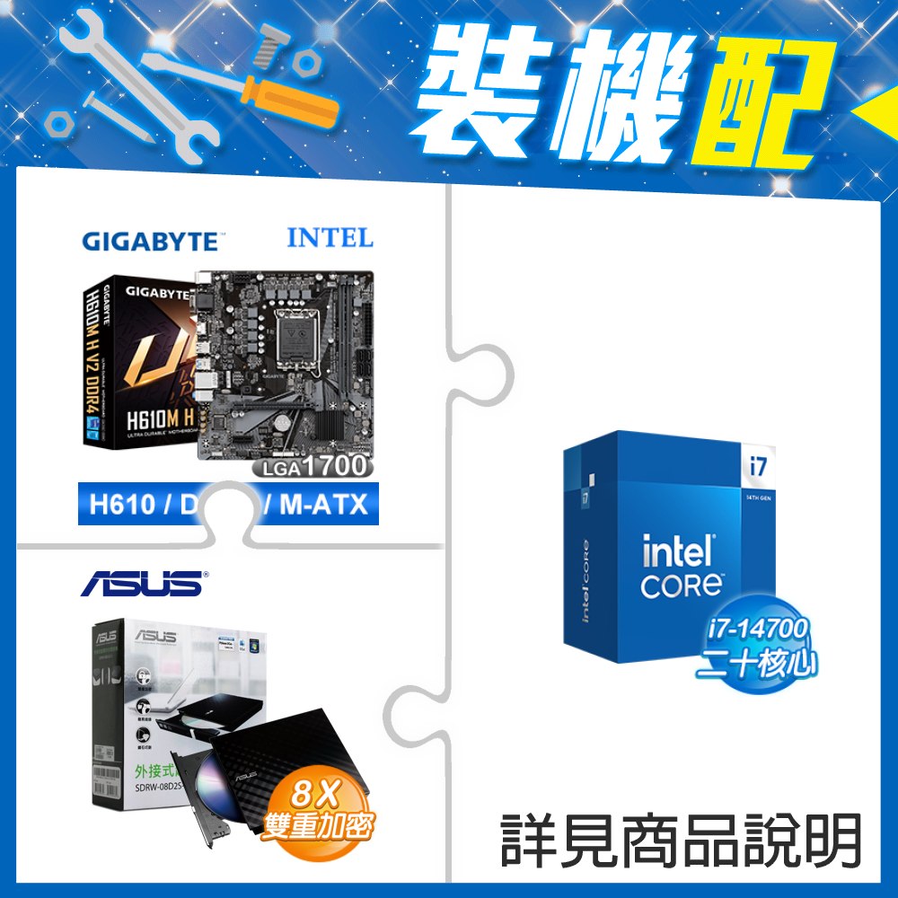 ☆裝機配★ i7-14700+技嘉 H610M H V2 D4 MATX主機板+華碩 SDRW-08D2S-U 外接式燒錄機《黑》