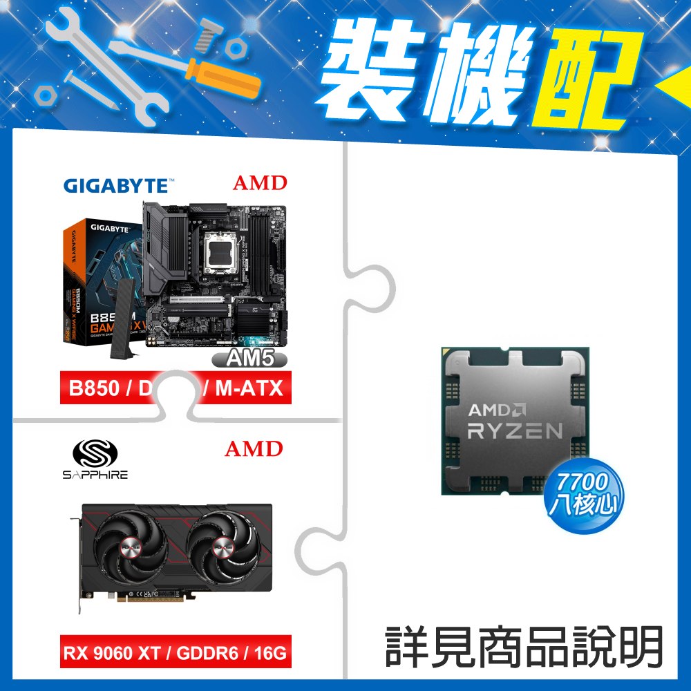 ☆裝機配★ AMD R7 7700 MPK+技嘉 B850M GAMING X WIFI6E MATX主機板+藍寶石 PULSE 脈動 RX 9060 XT GAMING OC 16GB 顯示卡